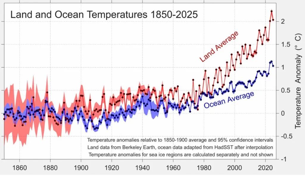 Seit 1970 weisen Thermometer auf dem Festland eine Erwärmung auf, die etwa doppelt so hoch ist wie die über den Ozeanen: