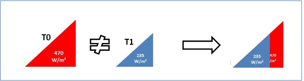 Selbstverständlich strahlen sich zwei Körper, hier rot und blau, ständig gegenseitig an. Aber wenn der geneigte Leser jetzt die unterschiedlichen Dreiecke als Symbole für die temperaturspezifischen Planck-Kurven versteht, dann wird offensichtlich, dass der kältere Körper gar nicht das Leistungsspektrum besitzt, um den wärmeren Körper noch weiter zu erwärmen. Denn wie wir auf der rechten Seite sehen, fehlt dem blauen Körper bereits der überstehende rote Teil, über den sein Spektrum ja noch weiter hinausgehen müsste, um den roten Körper noch weiter zu erwärmen. Um es also noch einmal ganz deutlich zu sagen: Die Erfindung einer atmosphärischen Wärmequelle namens „atmosphärischer Treibhauseffekt“ ist paraphysikalisch religionsstiftender Humbug. Erstens kann die Atmosphäre keine Energie erzeugen und zweitens könnte die kältere Atmosphäre die wärmere Erdoberfläche auch gar nicht weiter erwärmen. Der Effekt der Erdatmosphäre besteht vielmehr ganz im Gegenteil darin, dass die Energieübertragung zwischen der Erdoberfläche mit 15°C und der sogenannten „Abstrahlungshöhe“ mit -18°C allein durch Gastransport erfolgt. Und durch die gravitativ bedingte Ausdehnung des Luftvolumens beim Aufstieg von der Erdoberfläche zur „Abstrahlungshöhe“ sinkt dann ganz einfach dessen spezifischer Energieinhalt.