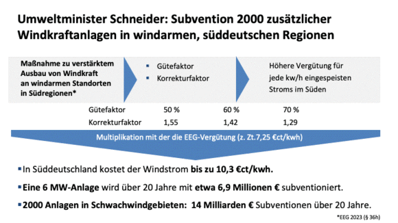 Worum geht es? Im Erneuerbaren-Energie-Gesetz (EEG) hatte Robert Habeck den § 36h hinzugefügt. Weil mit der normalen EEG-Vergütung niemand auf die Idee käme, im windschwachen Bayern, Baden-Württemberg, Südhessen und südlichen Rheinland-Pfalz ein Windkraftwerk zu errichten, weil es sich nicht rechnet, wurde ein Korrekturfaktor ins Gesetz eingebracht, der die EEG-Vergütung für den Süden auf das 1,55-fache erhöht, wenn der Wind nur 50 % des bundesdeutschen Referenzstandortes ausmacht. Wenn es nur 60 % sind, erhöht sich der Zuschlag um „nur“ das 1,42-fache, bei 70 % das 1,29-fache. Es ist wie bei den Schildbürgern: dort, wo wenig Wind ist, ist Windenergie besonders unwirtschaftlich und deswegen bezahlt der Steuerzahler mehr.