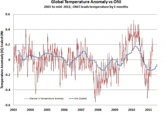 Es ist schwierig, den Beginn des gegenwärtigen Stillstands genau zu terminieren. Zwar wird oftmals das Jahr 1998 als Beginn genannt, doch war dies ein außerordentlich warmes Jahr wegen des stärksten El Niño seit Beginn instrumenteller Messungen. Diesem folgte ein starkes La Niña-Ereignis und ein Rückgang der globalen Temperatur um etwa 0,2°C (Abbildung 1). Das ist hinsichtlich der Größenordnung äquivalent zum mittleren dekadischen Erwärmungstrend der letzten Jahrzehnte. Tatsächlich ist der Anstieg der globalen Temperatur erst im Jahr 2000 zum Stillstand gekommen.