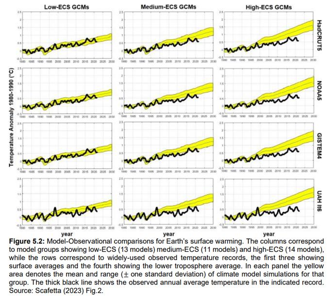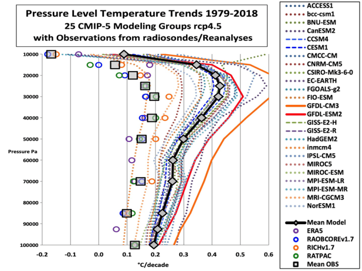 Wie oben erläutert, ist der Vergleich von Modellen mit Beobachtungen jedoch kein unabhängiger wissenschaftlicher Test. Die Verwendung der höheren Atmosphäre, in der sich die Joule an Energie aus steigenden Treibhausgaskonzentrationen ansammeln sollen, ist eine weitaus bessere Messgröße. Selbst CMIP-Modelle mit niedrigem ECS schneiden hier nicht gut ab. Die Reporter von Politico erwähnen dieses grundlegende Problem mit keinem Wort.