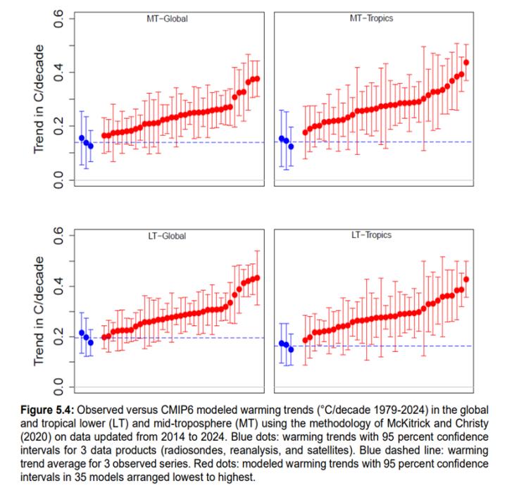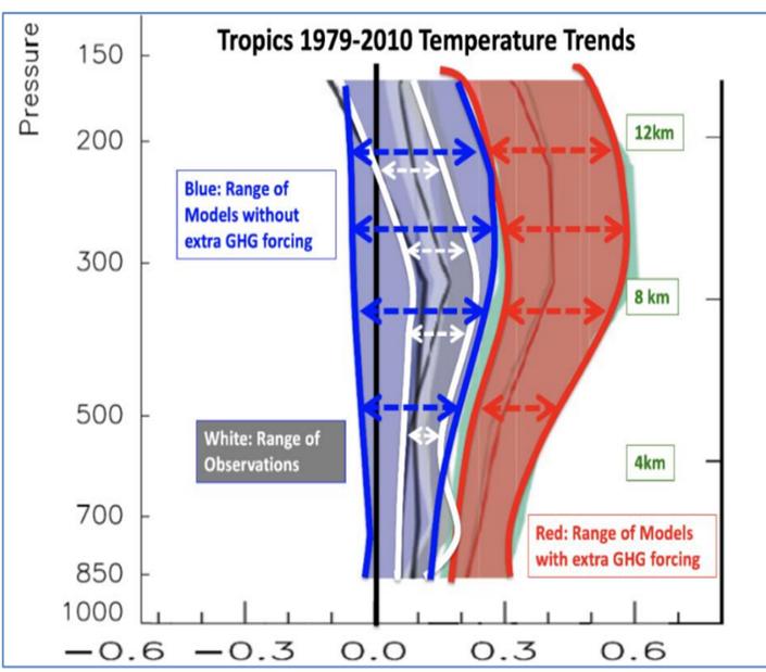 Wie die Autoren des DOE-Berichts, McKitrick und Christy, in einer in Earth and Space Science veröffentlichten, von Fachkollegen begutachteten Studie erklären, eignet sich die tropische mittlere Troposphäre in einzigartiger Weise für die Überprüfung der Gültigkeit von Klimamodellen. Das liegt daran, dass: (1) fast alle Modelle starke positive Rückkopplungen (beschleunigte Erwärmung) in der tropischen mittleren Troposphäre simulieren; (2) die Region durch Satelliten und Wetterballons gut überwacht wird; (3) die mittlere Troposphäre zu weit von der Oberfläche entfernt ist, um durch Landnutzungsänderungen beeinflusst zu werden; und (4) die Modelle zuvor nicht an die historische Klimatologie in dieser Region „angepasst” wurden und daher wirklich unabhängig von den zu ihrer Überprüfung verwendeten Daten sind.