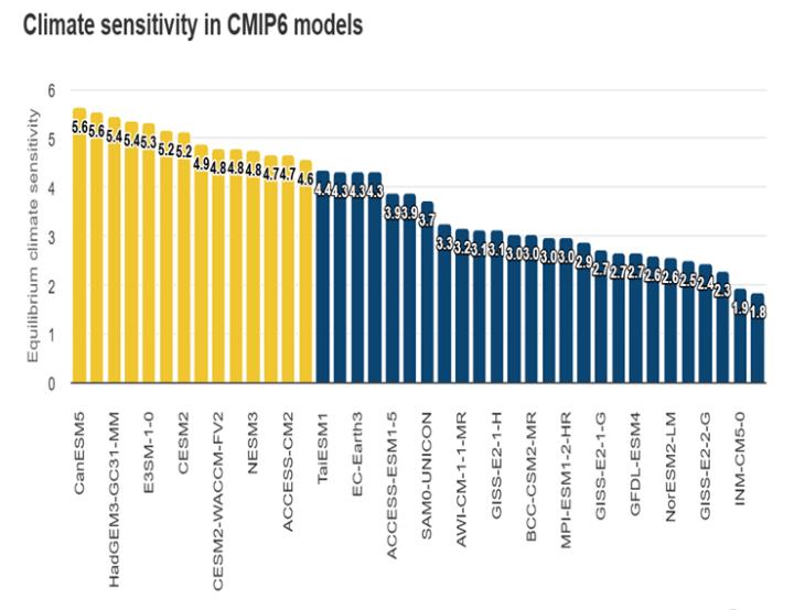 Quelle: Hausfather (2019). Gelbe Balken zeigen CMIP6-Modelle mit einer höheren Sensitivität als jedes CMIP5-Modell. Blaue Balken zeigen CMIP6-Modellsensitivitäten innerhalb des CMIP5-Bereichs.