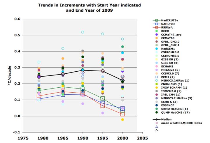 Der AR4-Bericht des IPCC aus dem Jahr 2007 war eine wichtige wissenschaftliche Grundlage für die Gefährdungsfeststellung. Der wichtigste Beitrag zum AR4 war das CMIP3-Modellensemble. In den 2000er Jahren war es noch schwierig, von Klimamodellierern Prognosen zur Troposphärentemperatur zu erhalten. Christy gelang es jedoch, Temperaturprognosen aus den Modellen zu gewinnen. Anschließend verglich er diese mit den Aufzeichnungen des britischen Climate Research Centre (HadCRUT) und den Satellitendaten, die an die Temperaturen angepasst worden waren. In der folgenden Grafik beginnen die Temperaturtrends in dem auf der X-Achse angegebenen Jahr und enden im Jahr 2009. Die Beobachtungen (Quadrate) liegen alle deutlich unter dem AR4-Modelldurchschnitt (Rauten) und erreichen in der Regel etwa nur die Hälfte des modellierten Trends.