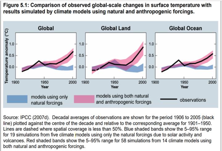 Wie die Grafik zeigt, ist AR4 die Quelle für die Annahme der TSD, dass Modelle realistisch sind, wenn sie sowohl mit natürlichen als auch mit anthropogenen „Antrieben” (Störungen, die das Gleichgewicht zwischen einfallender Sonnenstrahlung und ausgehender Infrarotstrahlung verändern) betrieben werden.