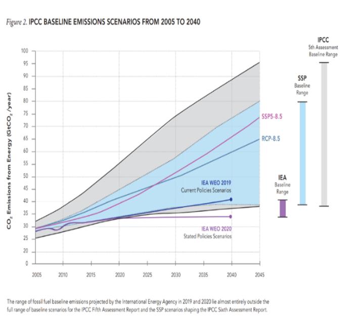 In den Szenarien „aktuelle Politik“ und „staatliche Politik“ der Internationalen Energieagentur (IEA) werden die globalen Emissionen bis zur Mitte des Jahrhunderts voraussichtlich nur etwa die Hälfte der Mengen in RCP8.5 und SSP5-8.5 betragen. Wie die nachstehende Grafik zeigt, liegen die von den IEA-Basisszenarien prognostizierten Emissionswerte „fast vollständig außerhalb“ der „Basiswerte“ des IPCC: