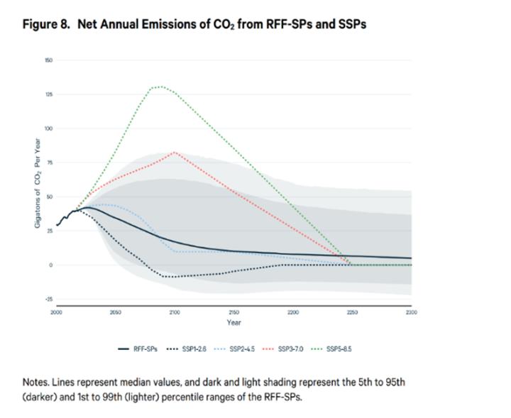 Im Jahr 2022 veröffentlichte Resources for the Future (RFF) aktualisierte Basis-Emissionsszenarien, die sich auf Prognosen der IEA und anderer Marktforschungsinstitute stützen. In der Basisprognose der RFF liegen die globalen CO2-Emissionen im Jahr 2050 bei etwa der Hälfte der in SSP5-8.5 prognostizierten Werte und im Jahr 2100 bei weniger als einem Fünftel der prognostizierten Werte. Die EPA übernahm die RFF-Basiswerte als die besten verfügbaren Werte für ihren Bericht vom November 2023 über die sozialen Kosten von Treibhausgasen.