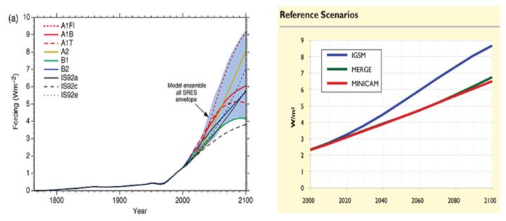 Pielke Jr. hat kürzlich die relevanten Informationen in seinem Blog veröffentlicht. Wie er erklärt, stützte sich die Gefährdungsfeststellung auf zwei Szenarien, um zukünftige Klimaveränderungen und die damit verbundenen Risiken zu prognostizieren: die sechs Szenarien, die im Sonderbericht des IPCC über Emissionsszenarien (SRES, 2000) entwickelt worden waren, und drei Szenarien des Climate Change Science Program (CCSP), die von Clarke et al. (2007) entwickelt worden waren.
