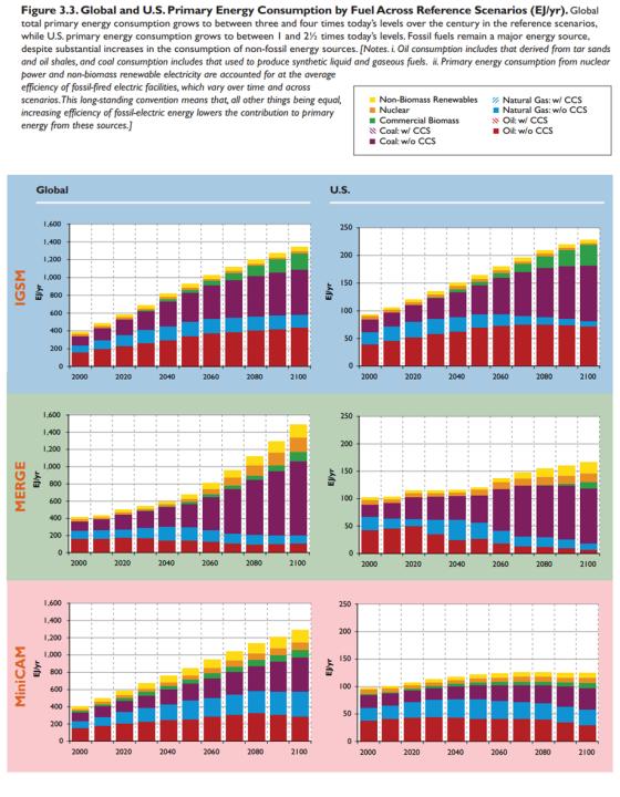 Die folgende Grafik zeigt die CCSP-Prognosen für den Energiemarkt. Die violetten Segmente stellen die prognostizierten Marktanteile von Kohle ohne Kohlenstoffabscheidung und -speicherung (CCS) dar. In jedem der sechs Felder steigt der Anteil von Kohle ohne CCS und wird entweder zum dominierenden Bestandteil des US-amerikanischen und globalen Energiemix oder zum größten Einzelbestandteil. „Das glaubt heute niemand mehr“, kommentiert Pielke Jr.