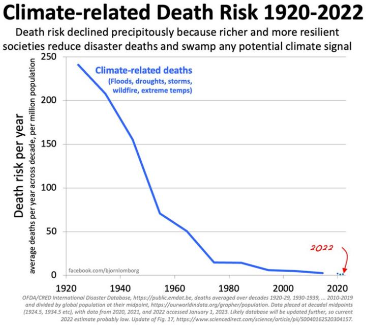 Berücksichtigt man die Vervierfachung der Weltbevölkerung seit den 1920er Jahren, so ist das Risiko einer durchschnittlichen Person, an den Folgen extremer Wetterereignisse zu sterben, um 99,4 Prozent gesunken.