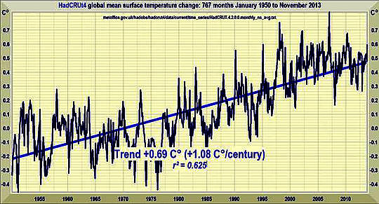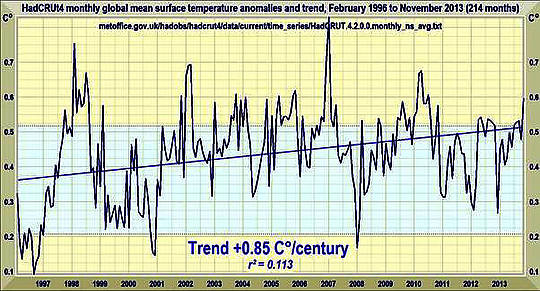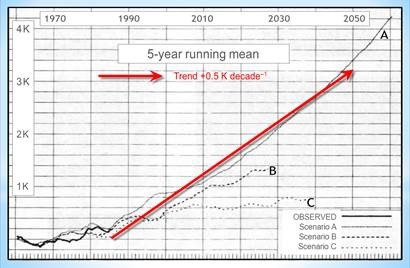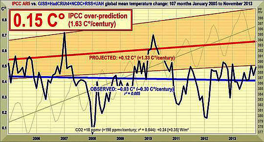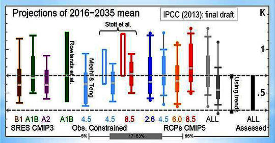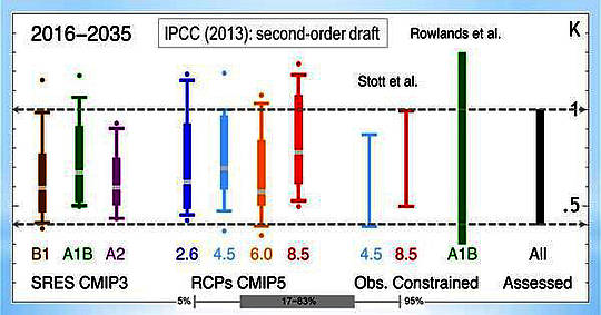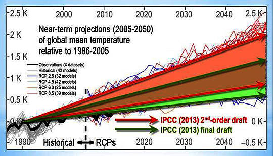 Der AR5 des IPCC aus dem vorigen Jahr datierte die Modellprojektionen zurück bis zum Jahr 2005. Darin wurde die zentrale Schätzung der globalen Erwärmung während der nächsten 30 Jahre praktisch um die Hälfte zurückgenommen, nämlich von einer Rate von 2,3°C pro Jahrhundert in der Vorversion auf eine solche von 1,3°C pro Jahrhundert in der Endversion.