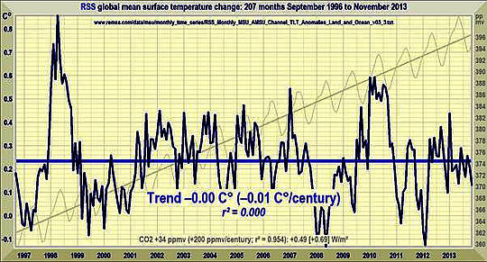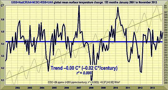 Und tatsächlich fangen schon ein oder zwei der schlimmsten Ganoven der globalen Erwärmung an zu behaupten, dass der Stillstand ihr Werk ist. Dabei muss man nur auf die stetig steigende graue CO2-Kurve in der Graphik schauen, um zu erkennen, dass das Unsinn ist.