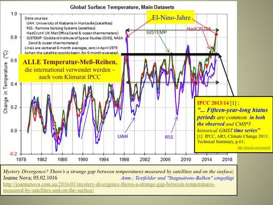 Wir erinnern uns: Die etablierte Klimaforschung und auch die mediale Öffentlichkeit war konsterniert, daß ausgerechnet der Klimarat IPCC in seinem jüngsten Bericht (2013/14) einen 15-jährigen(!) Erwärmungsstillstand ("Hiatus = Pause") zugestehen mußte. Es gab sogar intensive politische Bemühungen, insbesondere auch von deutschen Bundes-Ministerien, diesen Stillstand aus dem "Summary for Policymakers" heraus zu halten [X] ! Umgehend "erklärte" die etablierte Klimaforschung, daß es lt. WMO-Definition eines wenigstens "30-jährigen-Stillstandes bedürfe", um von einem Klima-Stillstand zu sprechen. Nun erwidert hier w.o. die DMG ihrem Kollegen Fett, daß schon 1…2 Jahre Erwärmung (2014/15) genügen, um die "Hiatus-Debatte für sinnlos zu erklären"; und das El-Nino-Wetter-Phänomen wird w.o. von der DMG "sicherheitshalber" gar nicht erst erwähnt. Was für eine seltsame Wissenschaft!
