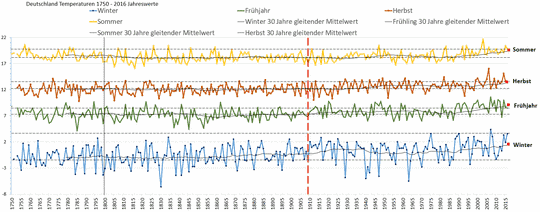Bild 2.1 Jahreszeitliche Temperaturverläufe von Deutschland 1750 – 2016, Jahreswerte und 30 Jahre gleitender Mittelwert. Der Sommer hat einen Offset von +2 Grad, der Herbst von +4 Grad. Die kleinen, roten Rechtecke am rechten Rand kennzeichnen +0,5 Grad zum Mittelwert. Die rote, gestrichelte Linie kennzeichnet den (wahrscheinlichen) Beginn des Klimawandel-Mittelwertes im Jahr 1909. Grafik vom Autor aus den DWD-Daten erstellt