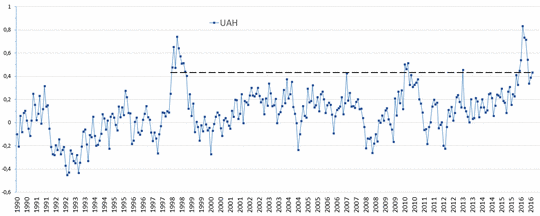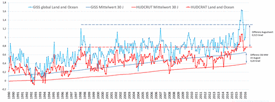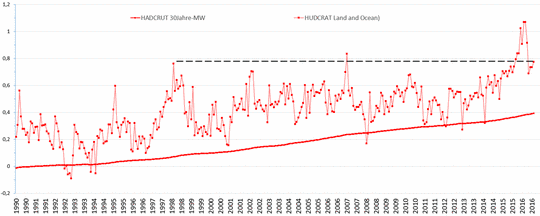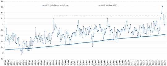 *Hinweis: Der „Hiatus“ (Wärmestillstand) seit genau diesen 20 Jahren wird beim 30-Jahre Mittelwertverlauf verdeckt. Er ist nur in Jahres- und Monatsauflösung erkennbar (siehe dazu auch Bild 2).