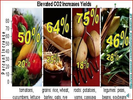 Die gegenwärtige Konzentration von CO2 in der Atmosphäre liegt etwa bei 390 ppm (parts per million). Eien Verdoppelung oder Verdreifachung dieses Niveaus in einem Treibhaus kann zu erheblichen Ertragssteigerungen bei der Erne führen. Es stellt sich dabei heraus, dass ein Anteil von 1000 bis 1400 ppm ideal wäre für den Anbau von Tomaten, Gurken und Salat mit einer Steigerung von 20% bis 50%; Getreide wie Reis, Weizen, Gerste, Hafer und Roggen mit einer Steigerung um 25% bis 64% Wurzeln wie Kartoffeln Yams und Maniok von 18% bis 75% sowie Gemüse wie Erbsen, Bohnen und Sojabohnen von 28 bis 46%!. Es ist wahrscheinlich, dass die Gentechnik neue Nahrungssorten hervorbringt, die mit einer Steigerung des CO2-Gehaltes auf 2000 ppm oder mehr sogar noch höhere Steigerungen ermöglicht.