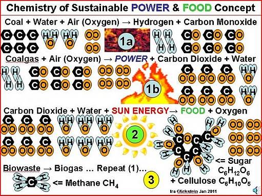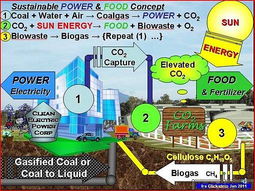 Das Konzept, das hier graphisch vorgestellt wird, basiert auf dem Gebrauch von unterirdisch vergaster Kohle (oder Kohleverflüssigung als Alternative) sowohl zur Erzeugung elektrischen STROMS und zur Sicherstellung von CO2 als Pflanzenfutter in einem angereicherten CO2-Treibhaus, dass NAHRUNG als Nebenprodukt erzeugt. Die ebenfalls anfallende Biomasse wird zur Erzeugung von Biogas als zusätzliche Energiequelle für die Stromerzeugung genutzt.