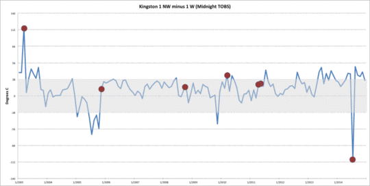 Unabhängig davon, wie viele Fehler gezählt worden sein sollten, ging aus der täglichen Aufzeichnung klar hervor, warum diese indiziert waren. Die Minimum-Temperatur vom 6. Februar lag höher als die Maximum-Temperatur am 7. Februar, was eine Unmöglichkeit ist. Gleiches galt für den 7. Februar relativ zum 8. Februar.