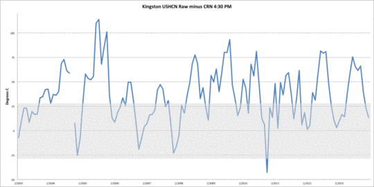 Zusätzlich zu einer falschen Maximum-Temperatur wurden alle drei Tage, die als nicht dem Qualitäts-Check genügend gekennzeichnet waren, nicht zur Berechnung des monatlichen Mittels verwendet. Das in der elektronischen Aufzeichnung reflektierte nicht adjustierte Mittel betrug 0,8°C, während es in der Aufzeichnung auf Papier 0,24°C betrug, also über ein halbes Grad kälter. Die Schätzung des Zeitpunktes der Beobachtung betrug 1,41°C. Das Homogenisierungsmodell kam zu dem Ergebnis, dass ein monatlicher Wert nicht aus täglichen Daten berechnet werden konnte und sonderte ihn aus. Stattdessen füllte es die Lücke mit dem Monat und ersetzte den Wert mit einer Schätzung von 0,21°C, berechnet aus Werten der umliegenden Stationen. Während dies keine schlechte Schätzung war, bleibt aber die Frage im Raum, ob der Wert bei 0,12°C geblieben wäre, wenn die Übertragung korrekt erfolgt wäre. Außerdem hat das GHCN den Monatswert nicht übernommen, weil er eingetragen worden ist.