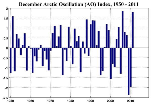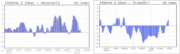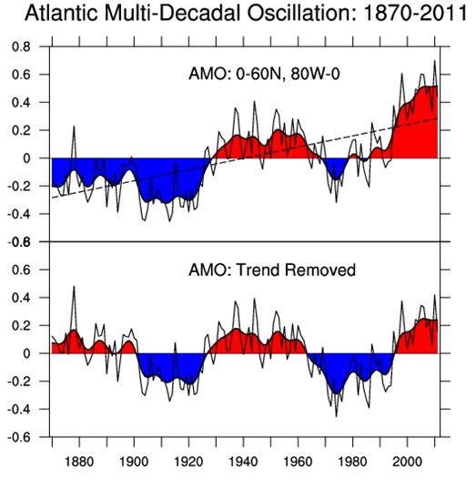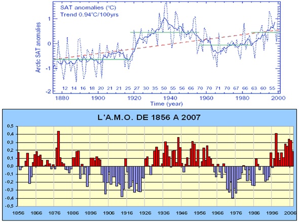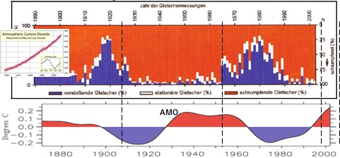 Die genaue Quantifizierung dieser Erwärmungseffekte durch die Veränderung der Häufigkeiten der Großwetterlagen ist jedoch schwierig. Wie noch gezeigt wird, werden diese Zirkulationsänderungen von der Sonnenaktivität wesentlich beeinflusst und über die Schwankungen der NAO (Nordatlantische Oszillation der Luftdruckverteilung) und der AMO (Atlantische Multidekaden- Oszillation der Wassertemperaturen) direkt gesteuert. Damit wird klar, dass auch hier eine „Trendumkehr“ möglich ist. In den Wintern 2008/09 bis 2011/12 kam es- zumindest monatsweise- schon zu einer deutlichen Abschwächung der Westwetterlagen, was auf eine beginnende Trendumkehr hindeuten könnte.