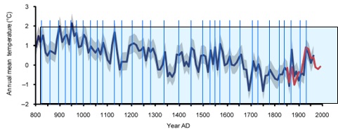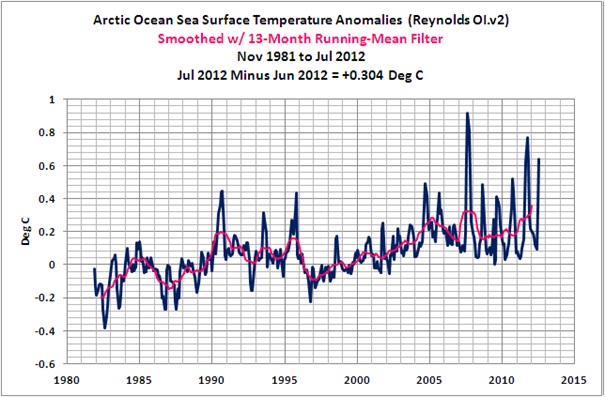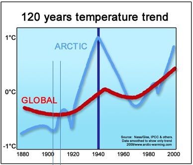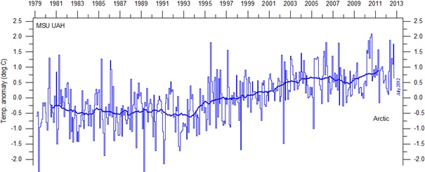 Man könnte nun den voreiligen Schluss ziehen, dass vielleicht zunehmende NAO- Werte für einen Teil des Temperaturanstiegs seit 1979 verantwortlich sind, denn auch zurzeit des „Klimasprungs“ um 1990 herrschten positive NAO- Werte vor. Dem ist aber nicht so, denn die NAO- Indizes zeigen (wie dargelegt, von der Sonnenaktivität moderiert), eine leicht fallende Tendenz: