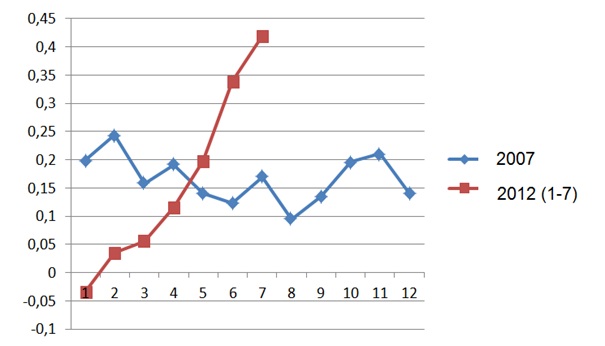 Weiterhin muss erwähnt werden, dass die monatliche Sonnenscheindauer im Sommerhalbjahr mit Bestimmtheitsmaßen von 35 bis über 70% die Monatsmitteltemperaturen wesentlich stärker beeinflusst als im Winterhalbjahr mit Bestimmtheitsmaßen von nur 6 bis kaum 14%. Kurzum- mehr als zwei Drittel der vergangenen Erwärmung in den Sommermonaten lassen sich aus der Sonnenscheindauer erklären, während besonders für das Winterhalbjahr nach weiteren Ursachen gesucht werden muss.