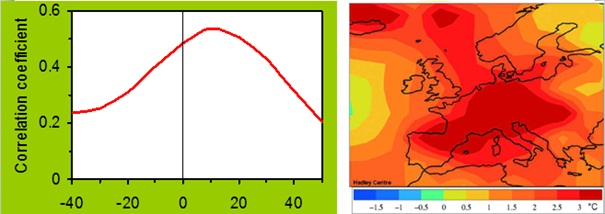 Der NAO- Index wird täglich mit Hilfe der 00- UTC- 500- Hektopascal- Anomalien über der Nordhemisphäre berechnet). Der Zusammenhang zwischen den NAO- Indizes (Jahresmittelwerte) und den Jahresmitteltemperaturen ist aber allenfalls mäßig (Abbildung 9):