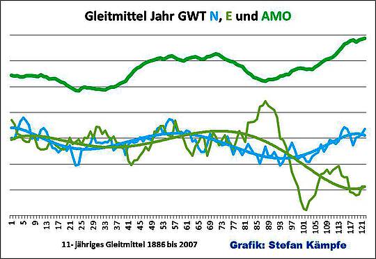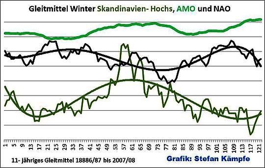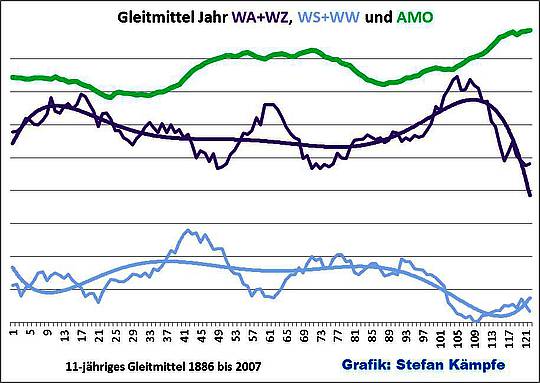 1. Falls die AMO ihre bisherige Rhythmik beibehält, hat sie aktuell ihr Maximum erreicht oder bereits leicht überschritten, so dass im Atlantik für die kommenden 20 bis 30 Jahre mit fallenden Wassertemperaturen zu rechnen ist. Die seit 2003 insgesamt stark rückläufige Sonnenaktivität dürfte sich nach den (freilich mit Unsicherheiten behafteten) Vorhersagen (ABDUSSAMATOV 2012, CALDER/SVENSMARK 2007, MALBERG 2002 bis 2013; VAHRENHOLT/LÜNING 2012, LANDSCHEIDT 1983, LEISTENSCHNEIDER, 2011) bis mindestens etwa 2050 weiter abschwächen, was sich zeitverzögert auch auf die AMO auswirken kann, so dass insgesamt eine Abnahme der Wassertemperaturen im 21. Jahrhundert nicht unwahrscheinlich ist.