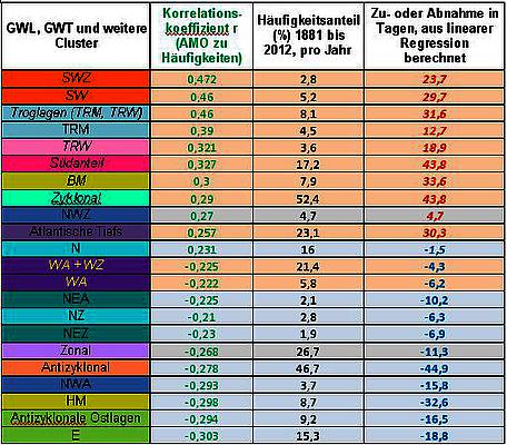 Die vorhergesagte Häufung „immer milderer Winter“ ist ausgeblieben, denn die dafür verantwortlichen Wetterlagen sind in den ersten 13 Wintern des 21. Jahrhunderts deutlich seltener geworden, was sich auch schon in den dämpfend wirkenden Gleitmitteln zeigt. Vielmehr unterliegt die Häufigkeit der „Westwetterlagen“ im Winter periodischen Schwankungen, die unter anderem von der NAO und der AMO beeinflusst werden. Und genau diese Tatsache ist auch dem Deutschen Wetterdienst (DWD) seit mehr als 10 Jahren bekannt. Der DWD- Autor P. BISSOLLI schrieb in seiner Arbeit „Kommen Westlagen häufiger vor als früher?“, veröffentlicht im Klimastatusbericht 1999, folgendes: „… . Dies bedeutet, dass eine Häufung von Westwetterlagen, die zweifellos während der letzten Jahre stattgefunden hat, zwar deutliche Auswirkungen auf die Wintermitteltemperaturen haben kann, aber eine einfache Kausalkette anthropogener Treibhauseffekt- mehr Westlagen- mildere Winter lässt sich dennoch nicht ohne weiteres aufstellen. …“ Wie sich nun zeigt, eine weise Formulierung, vermutlich hat er mit dem Rückgang der Westlagenhäufigkeit bereits gerechnet. Schade, dass solcherlei Erkenntnisse nie den Weg über die Medien in die breite Öffentlichkeit finden. Und wie sieht es mit der „katastrophalen Häufung der Winterstürme“ aus? Eine Voruntersuchung im Rahmen dieser Arbeit ergab, dass, bis auf ganz wenige Ausnahmen, schwere Winterstürme von 3 Großwetterlagen (WZ, NWZ, mitunter auch SWZ) verursacht werden, die im Cluster „Atlantische Tiefs“ zusammengefasst sind: