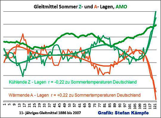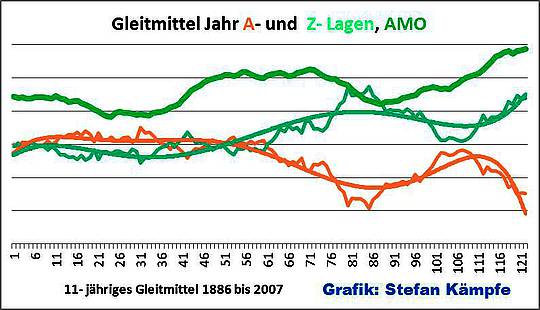 2. …die AMO das Häufigkeitsverhalten bestimmter Wetterlagen andeutungsweise mit beeinflusst, wobei meist erwärmend wirkende Süd- und Südwestlagen mit steigenden Wassertemperaturen tendenziell häufiger und solche mit nördlichen bis östlichen Strömungsanteilen eher seltener wurden. Dabei „schwingen“ nördliche Lagen im Takt der AMO; Westlagen im engeren Sinne verhalten sich entgegengesetzt. Übergeordnete Antriebsmechanismen für dieses Verhalten werden vermutet.