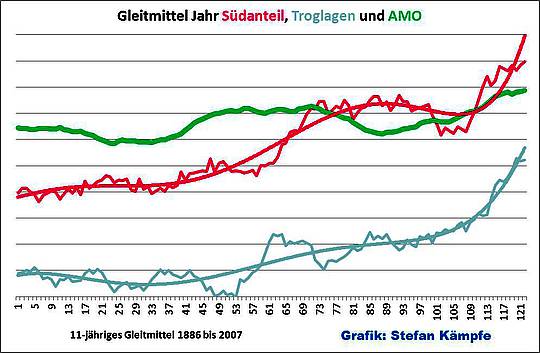 3. …es insgesamt eine (bislang dauerhafte) Häufigkeitszunahme nur bei den Süd- und vor allem den Südwestlagen sowie bei den Troglagen gab. Die in Mitteleuropa insgesamt viel häufigen Westlagen zeigen hingegen eine rhythmische Zu- und Abnahme, die andeutungsweise von der AMO, im Winter außerdem deutlich von der NAO, beeinflusst wird, was besonders im Winter Auswirkungen auf die Deutschland- Temperaturen hat (tendenziell mildere Winter in Phasen mit positiven NAO- Indizes und häufigeren Westlagen).