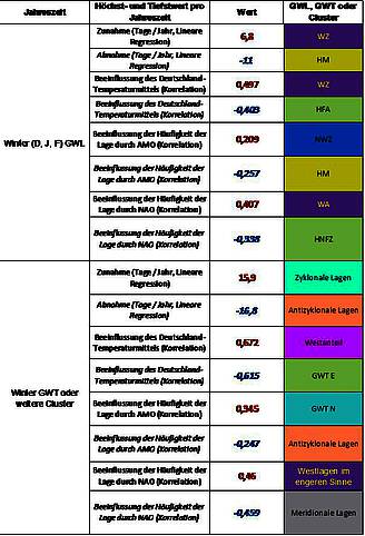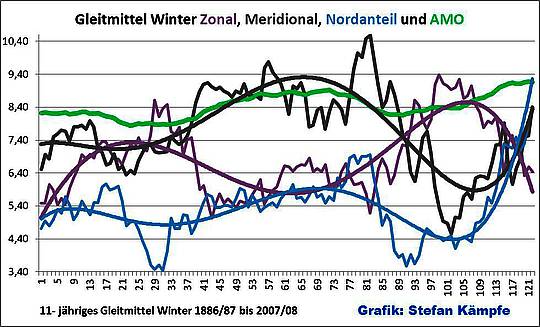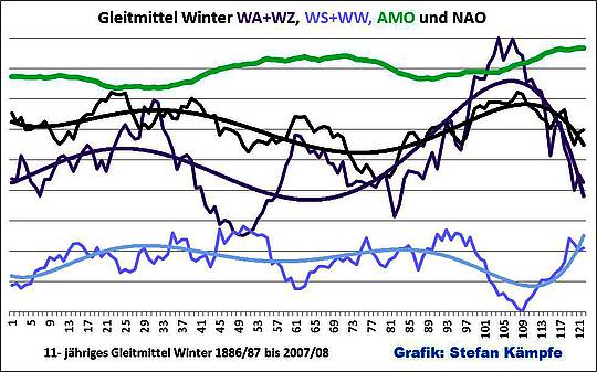 Nun muss aber noch die Frage geklärt werden, warum die Winter im frühen 21. Jahrhundert bislang wieder etwas kälter wurden, obwohl in den Abb. 10 und 11 bisher kein wesentlicher Häufigkeitsanstieg der sehr winterkalten Lagen am Ende des Untersuchungszeitraums erkennbar wird. Die folgende Abbildung zeigt die Ursachen dafür: