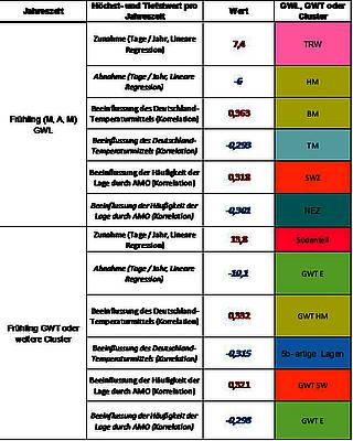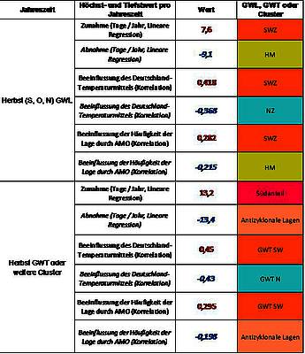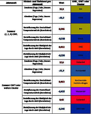 1. …die Deutschland- Temperaturen von der AMO und der Häufigkeit bestimmter Wetterlagen mit beeinflusst werden, wobei die Zusammenhänge im Jahresmittel nur gering bis mäßig sind. Im Winter üben jedoch die meisten Wetterlagen mit westlicher Strömung und solche mit östlicher Strömung einen sogar dominanten Einfluss auf die Deutschland- Temperaturen aus. Dies gilt außerdem für die einzelnen Wintermonate sowie für einzelne Sommermonate, jedoch nur für das Cluster „Kontinentale Hochdrucklagen“. Ansonsten vermag die Länge und Intensität der Sonnenscheindauer in der strahlungsreicheren Jahreszeit luftmassenbedingte Unterschiede, welche von den verschiedenen Großwetterlagen und deren Häufigkeitsverteilung verursacht werden, teilweise auszugleichen, so dass zwischen Ende März und Anfang Oktober insgesamt nur mäßige Zusammenhänge zwischen Wetterlagen und Temperaturen bestehen.