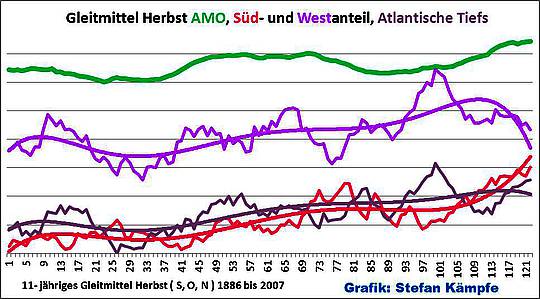 Abb. 8: Die bis zum Ende des 20. Jahrhunderts währende starke Häufigkeitszunahme Atlantischer Tiefs (Grauviolett, unterste Kurve) erklärt, warum es in der 2. Hälfte des 20. Jahrhunderts, besonders aber in den 1990er Jahren, gehäuft schwere Winterstürme in Deutschland gab, doch auch hier zeigt sich die Abnahme im frühen 21. Jahrhundert.