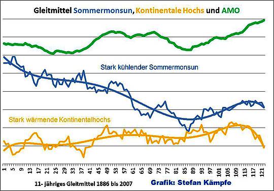 Ob ein Sommer (der Meteorologische, also Juni bis August) trocken- warm oder eher feucht- kühl ausfällt, entscheiden die vorherrschenden Großwetterlagen. Trocken- warmes Hochdruckwetter beinhaltet das Cluster „Kontinentale Hochs“, das sind Großwetterlagen, bei denen überwiegend Luftmassen kontinentaler Prägung nach Deutschland gelangen. Feucht- kühles Wetter umfasst das Cluster „Sommermonsun“, das sind wolkenreiche West- bis Nordwest- oder Nordlagen mit überwiegend Meeresluftmassen, die den Temperaturausgleich zwischen dem sommerwarmen Festland und dem kühleren Meer herstellen (siehe Teil 1, Tabelle der Wetterlagen). Der Begriff „Sommermonsun“ wurde unter anderem von KOCH (1953) geprägt. Natürlich hat der mitteleuropäische Sommermonsun keinesfalls die Intensität, Bedeutung und die Beständigkeit der asiatischen Monsune, außerdem ist sein Wirkeffekt auf die erweiterte Grenzschicht bis maximal 2500 Meter Höhe beschränkt, aber er bewirkt doch, dass die in Mitteleuropa meist westliche Strömung im Hochsommer etwas auf Nordwest dreht. Wir sehen, wie sich die Häufigkeit dieser sehr gegensätzlichen Cluster im Meteorologischen Sommer verändert hat (Zur Orientierung wird auch stets wieder die AMO bei diesen Gleitmitteln gezeigt):