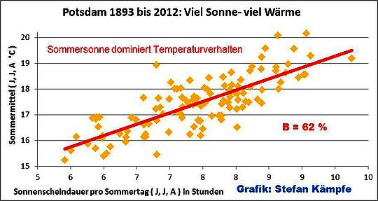 Abb. 3: Die sommerliche Sonnenscheindauer beeinflusste die Variabilität der Sommertemperaturen in Potsdam mit 62% sehr stark. Dieses Ergebnis ist nicht auf ganz Deutschland übertragbar- dennoch zeigt es, dass es wohl nicht die geänderten Häufigkeitsverhältnisse der Großwetterlagen waren, welche den leichten Anstieg der sommerlichen Lufttemperaturen vorrangig verursachten. Quelle des Datenmaterials: PIK