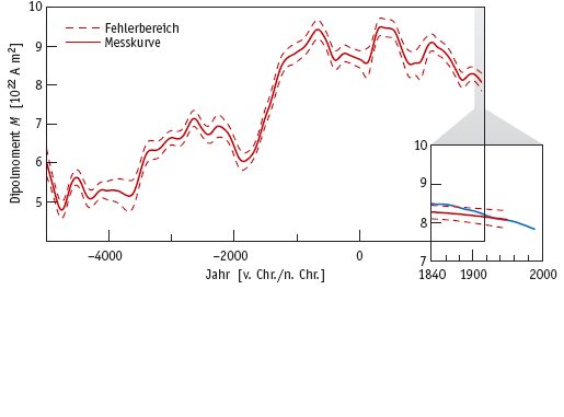 Auch heute findet übrigens eine Fluktuation des Erdmagnetfeldes statt, wie aus S.d.W. 09/05, S. 54 “Geheimnisvoller Geodynamo“ zu entnehmen ist und die daraus entnommene Abbildung zeigt:
