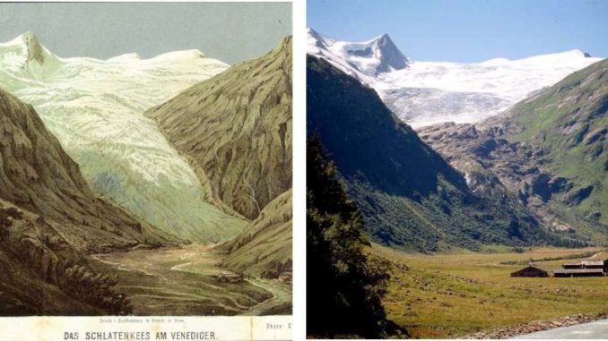 Abb 1: Gletscher auf dem Rückzug: Das Schlatenkees am Venediger 1852 (links) und 1995 (rechts). Als Beweis für einen menschengemachten Klimawandel denkbar ungeeignet.