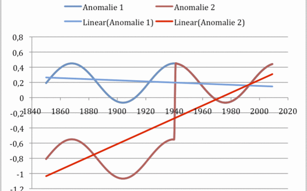 Machen wir dazu die Probe aufs Exempel, indem wir einen Anomalienverlauf aus einem (künstlichen) sinusförmigen Temperaturverlauf von 1850 bis 2009 erzeugen. Blau sei der Anomalienverlauf ohne Fehler. Die Anomalie verläuft fast gradlinig, wie die blaue Trendlinie anzeigt. Ab 1940 wird nun ein Fehler von + 1 K eingefügt. Gemäß Rechenanweisung w.o. wird dann aus beiden Werten für alle Jahre (x) die Differenz gebildet. Ab 1940 hebt sich der Fehler auf. Beide Verläufe gehen ineinander über. Vor 1940 jedoch wird allein durch den Rechenprozess die Temperaturanomalie um 1 k abgesenkt. Wir sehen, die Annahme von vorhin gilt nur für die Zeit nach 1940. Vorher nicht. Lässt man Excel eine Trendgerade durch diese Werte legen, dann sehen wir, dass sich beide erheblich unterscheiden.