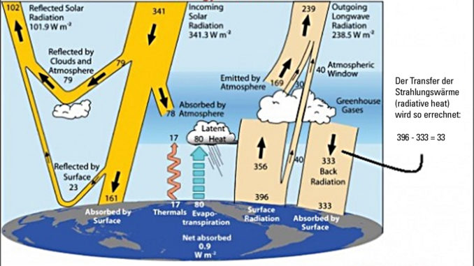 Das Ungewöhnliche an dieser Grafik ist: Sie zeigt nicht den Wärmetransfer durch Abstrahlung von der Erdoberfläche. Stattdessen beschreibt sie den Treibhauseffekt in Form eines Strahlungsflusses, so wie die Autoren ihn sehen. Anders gesagt, als elektromagnetische Strahlung. Dazu enthält sie weitere Beschreibungen, mit denen Naturwissenschaftler auf dem Kriegsfuß stehen. Die elektromagnetische Strahlung ist eine Energieform, die häufig mit Wärme verwechselt wird. Später wird gezeigt, dass die oben dargestellte Oberflächenabstrahlung (Surface Radiation) von 396 W/m2 sich ganz anders als Wärme verhält. Auch kann eine Temperaturänderung in Materie nur stattfinden, wenn es Wärmeaustausch gibt, ganz gleich, wie viel elektromagnetische Strahlung in der Atmosphäre herumsaust.