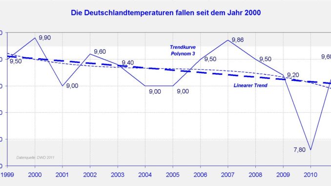 (an der blauen gestrichelten Durchschnittlinie sieht man), dass zwischen 1960 und 1985 ein „Temperaturloch“ (Kaltzeit, vergleiche, die in den 1970-Jahren in Politik, Presse und Wissenschaft kursierende Furcht einer anstehenden Eiszeit) in Deutschland war und dann die Jahresmittelwerte bis zum Jahre 2000 ständig gestiegen sind. Seit über einem Jahrzehnt sinken die Temperaturen erneut, und zwar deutschland- und auch weltweit.