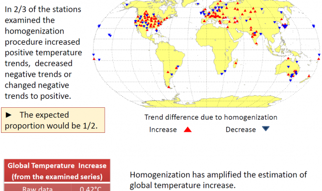 Die COST Action HOME hat mir gebeten ihre Homogenisierungsverfahren zu überprüfen weil ich kein Klimatologe bin. Deswegen kenne ich mich inzwischen mit den Homogenisierungsverfahren einigermaßen aus und kann sagen, dass die Studie die in diesem Post beschrieben wird Fehler enthält einige davon sind auf meinem Blog beschrieben. Und jeder der denken kann sollte sehen dass der Titel: „Die Hälfte der globalen Erwärmung kommt aus der Homogenisierung von Wetterstationsdaten“ nicht mal passt zu den Folgerungen der Studie, die nur wenn auch falscherweise behauptet, dass der Trend kleiner als 0.7 °C pro Jahrhundert ist, aber nirgendwo, dass es die Hälfte von 0.7 °C pro Jahrhundert ist.