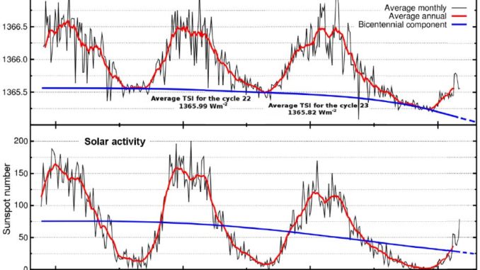 Da die Sonne sich derzeit der Phase der zweihundertjährigen Abnahme der Helligkeit nähert, basierend auf dem beobachteten beschleunigten Rückgang sowohl der elf- als auch der zweihundertjährigen TSI-Komponenten seit Anfang der neunziger Jahre, können wir die weitere Abnahme vorhersagen hin zu einem sog. Maunder-Minimum von 1363,4 ± 0,8 W/m², 1361,0 ± 1,6 W/m² und zu einem Tiefststand von 1359,5 ± 2,3 W/m² in den Minima zwischen den Zyklen 24/25, 25/26 und 26/27 (Abbildung 3).