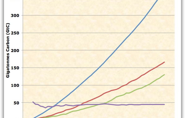Abbildung: Gesamte akkumulierte Kohlenstoff-Emissionen (blau), akkumulierter abgeschiedener Kohlenstoff (absorbiert) durch den Planeten (grün) und der akkumulierte, in der Atmosphäre verbleibende Kohlenstoff (rot). Die violette Linie zeigt den „Luftanteil“, also die in der Atmosphäre als Prozentsatz der emittierten Menge verbleibende Menge Kohlenstoff. Man beachte die zugrunde liegende Beziehung, dass nämlich die Gesamtemission die Summe der abgeschiedenen Menge plus die in der Atmosphäre verbliebene Menge ist, oder: Emittiert = verblieben + abgeschieden. Datenquellen: Fossil fuel CO2 emissions – Land use CO2 emissions – Airborne CO2 levels. Der Konversionsfaktor von 2,13 Gigatonnen Kohlenstoff gleich 1 ppmv atmosphärischen CO2 wurde zur Umrechnung zwischen den Einheiten benutzt.