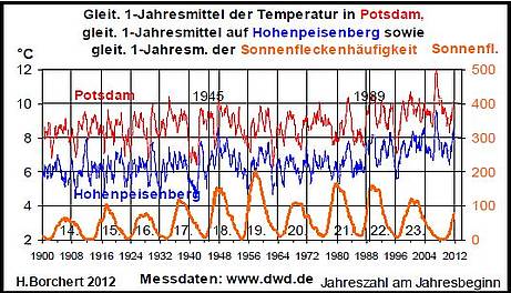 Die bodennahen Temperaturen in Potsdam und Hohenpeisenberg und Sonnenfleckenhäufigkeit von 1900 bis 2012