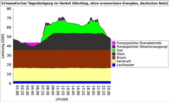 Bild 1. Typischer Tageslastgang im deutschen Netz an einem Werktag im Herbst, ohne „erneuerbare“ Energien (Grafik: Wikimedia Creative Commons)
