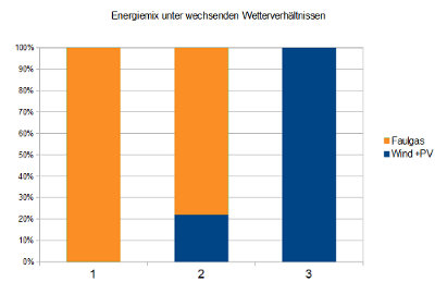 Um ganzjährig ohne Speicher und nur mit Faulgas als Regelenergie eine stabile Versorgung aufzubauen, müsste rechnerisch rund 84% des Stroms aus Biomasse hergestellt werden. Bei diesem optimierten Mix müsste der weitere Ausbau von Wind- und Solarenergie, der mit 12,4% schon nahe am optimalen Wert von 15,6% liegt, bereits jetzt fast völlig völlig gestoppt werden.