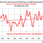 Ihrer Argumentation zufolge sollte der ozeanische Wärmegehalt des westlichen tropischen Pazifiks während der Periode des Stillstandes zunehmen. In einer Ihrer jüngsten Studien schreiben Sie, dass der Stillstand im Jahre 1999 begonnen hatte, und zwar mit dem Übergang der Pazifischen Dekadischen Oszillation von der positiven in die negative Phase. Sie haben das als Proxy für die ENSO-Zustände verwendet. Abbildung 1 zeigt den NOCD-Wärmegehalt des Ozeans im westlichen tropischen Pazifik (24°S – 24°N; 120°E – 180°); Wassertiefe 0 bis 700 m, Zeitraum Januar 1999 bis Dezember 2013. Man erkennt, dass sich der westliche tropische Pazifik tatsächlich bis zu einer Tiefe von 700 m erwärmt hat.