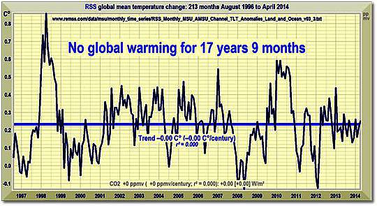 Der Stillstand setzt sich derweil fort. Die RSS-Satellitendaten für April 2014 sind jetzt verfügbar. Der aktualisierte Graph zeigt seit 17 Jahren und 9 Monaten keine globale Erwärmung.