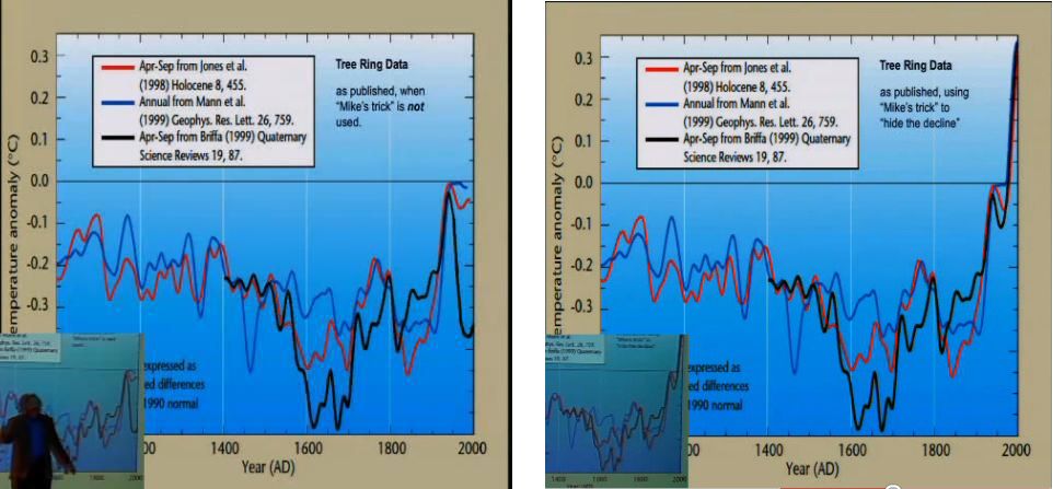 Man beachte, dass Jones genau erklärt, was er mit „Mikes Nature Trick“ meint. Mann hat behauptet, dass sein „Nature Trick“ nichts weiter war als die klare Abbildung von Beobachtungen und Rekonstruktionen in der gleichen Graphik mit geeigneter Beschriftung. Aber der direkte Vergleich von Beobachtungen mit Rekonstruktionen ist so alt wie die Statistik selbst – und Jones und Briffa haben selbst solche Vergleiche in früheren Artikeln gezogen, ohne eine angemessene Beschriftung als mehr zu betrachten als elementare Hygiene. In dieser E-Mail (die oftmals verkürzt zitiert wird) sagt Jones, dass Manns „Nature Trick“ die „realen Temperaturen zu jeder Reihe der letzten 20 Jahre hinzufügt (d. h. seit 1981) und ab 1961 zu denen von Keith“, wie ursprünglich im November 2009 hier erklärt.